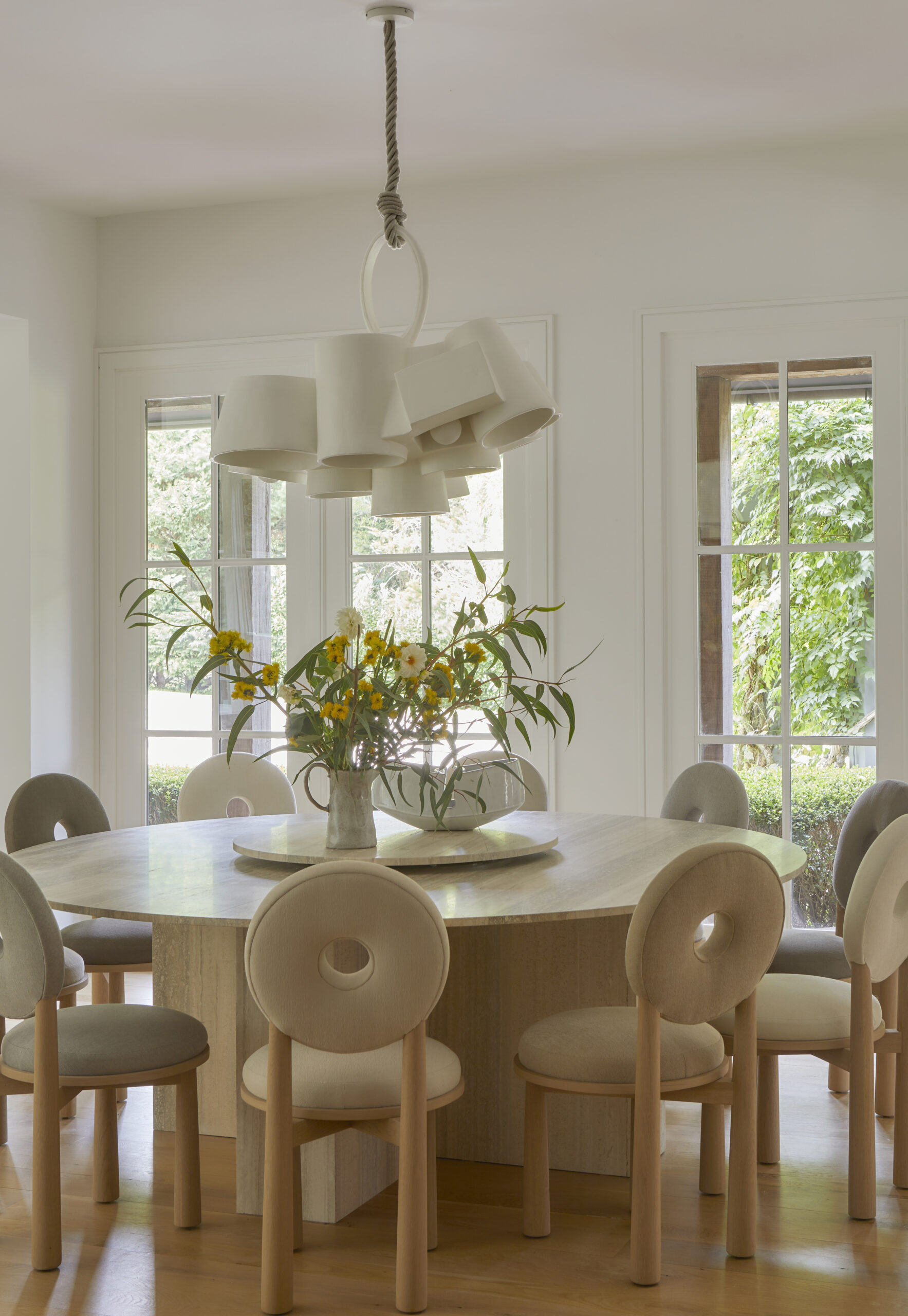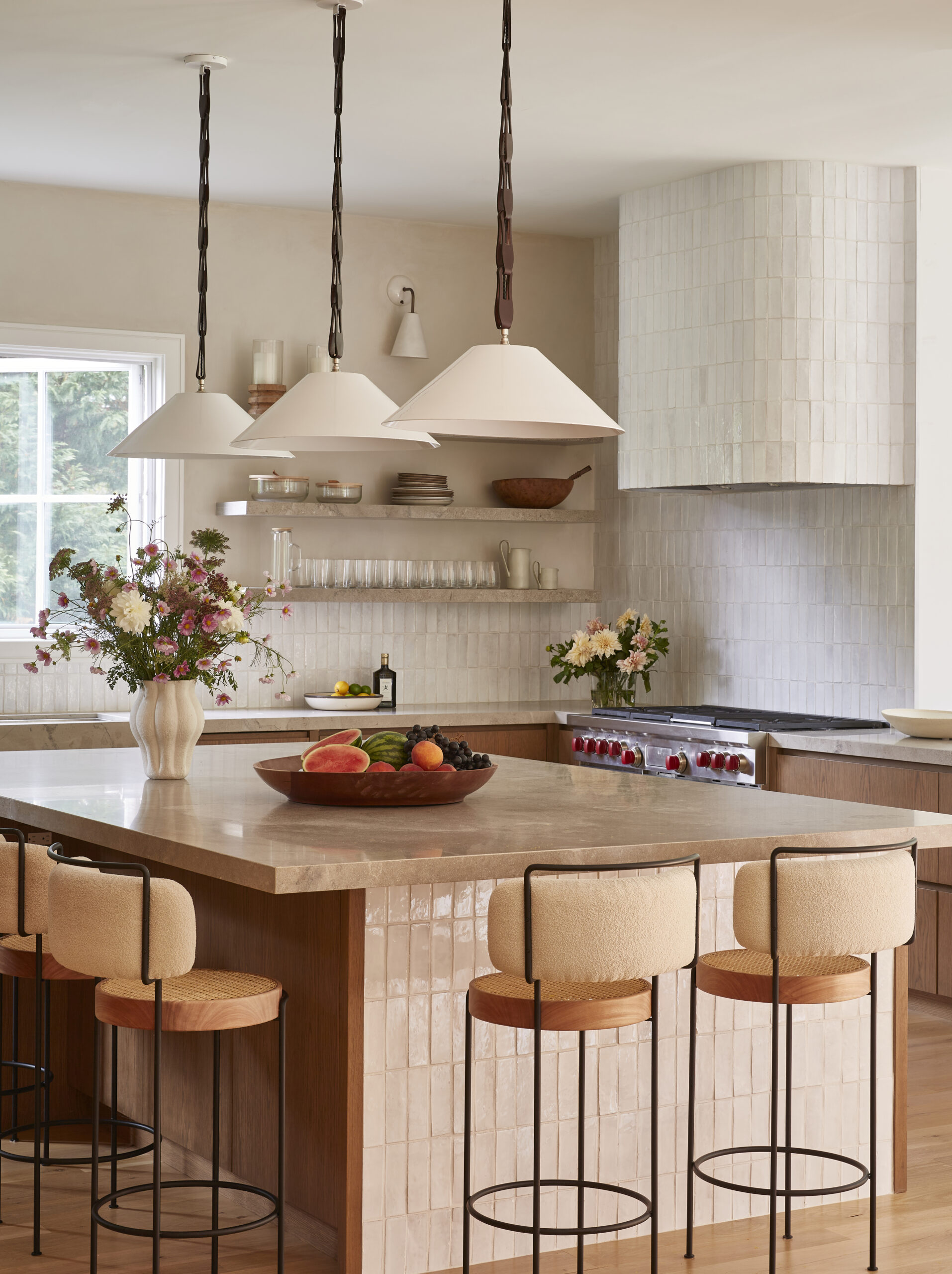 This Water Mill residence embraces its coastal setting, highlighting the expansive ceilings, large windows with lots of natural sunlight, and the home’s original architectural details. A neutral palette was used to create relaxed, welcoming spaces for everyday living and easy entertaining.