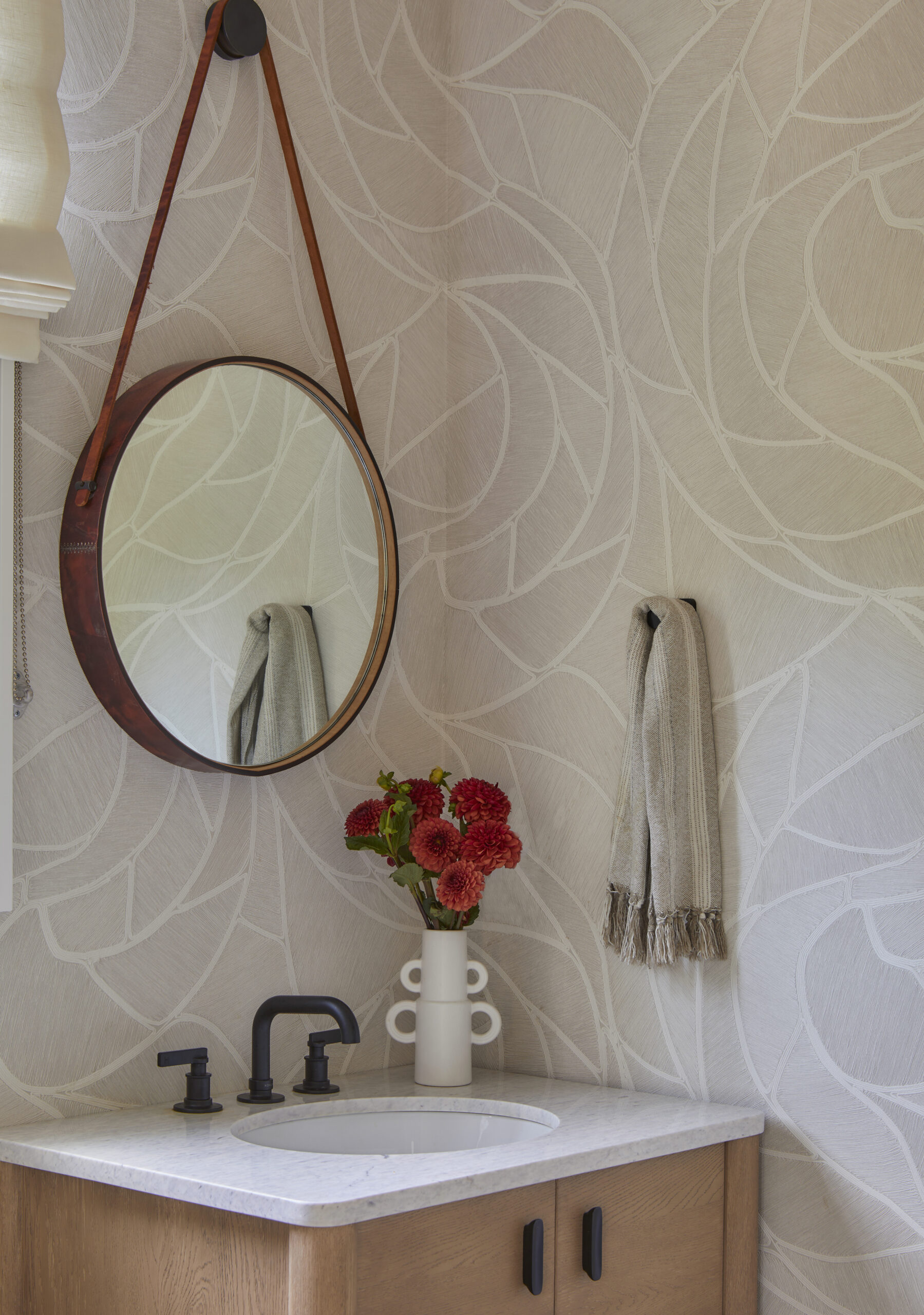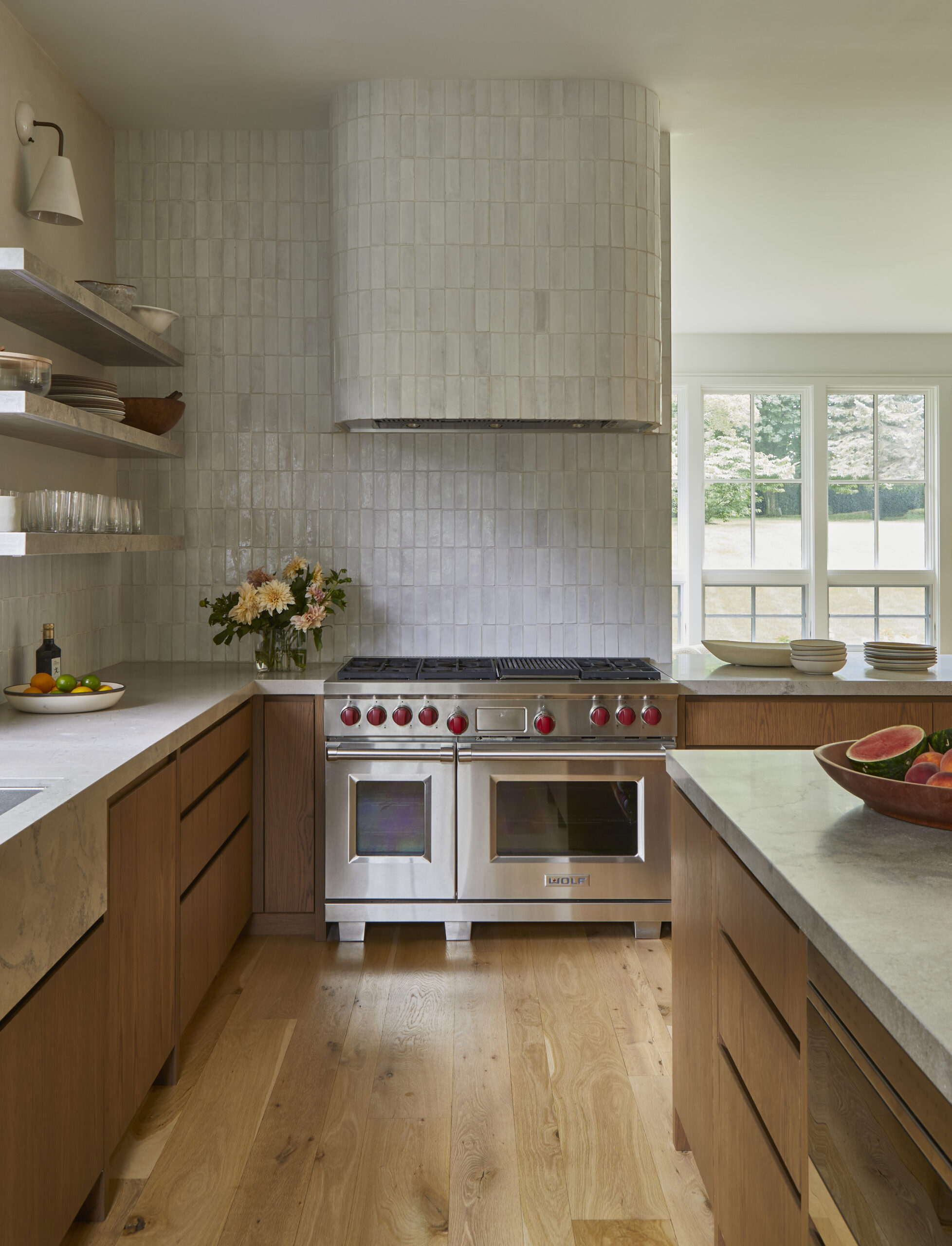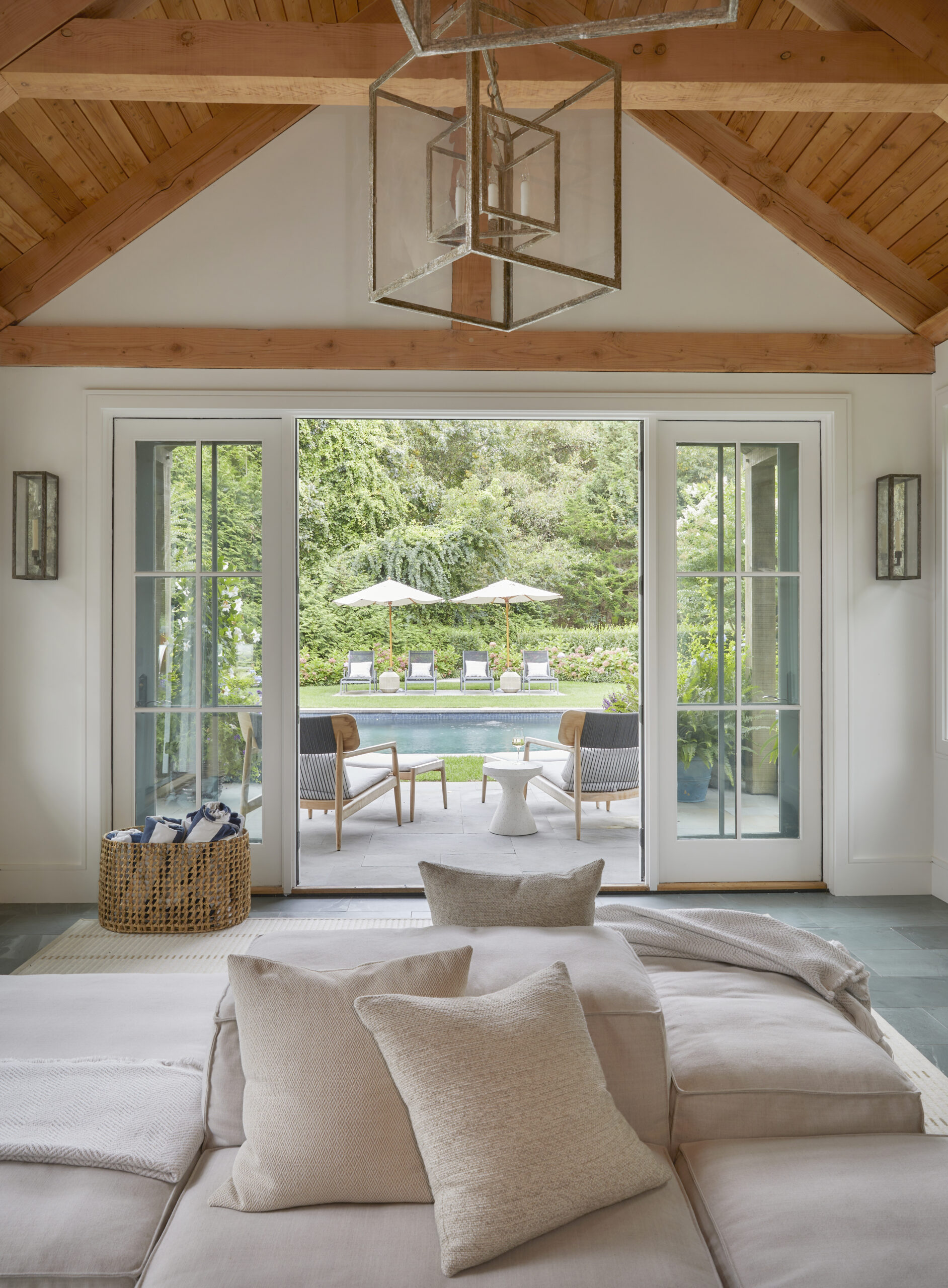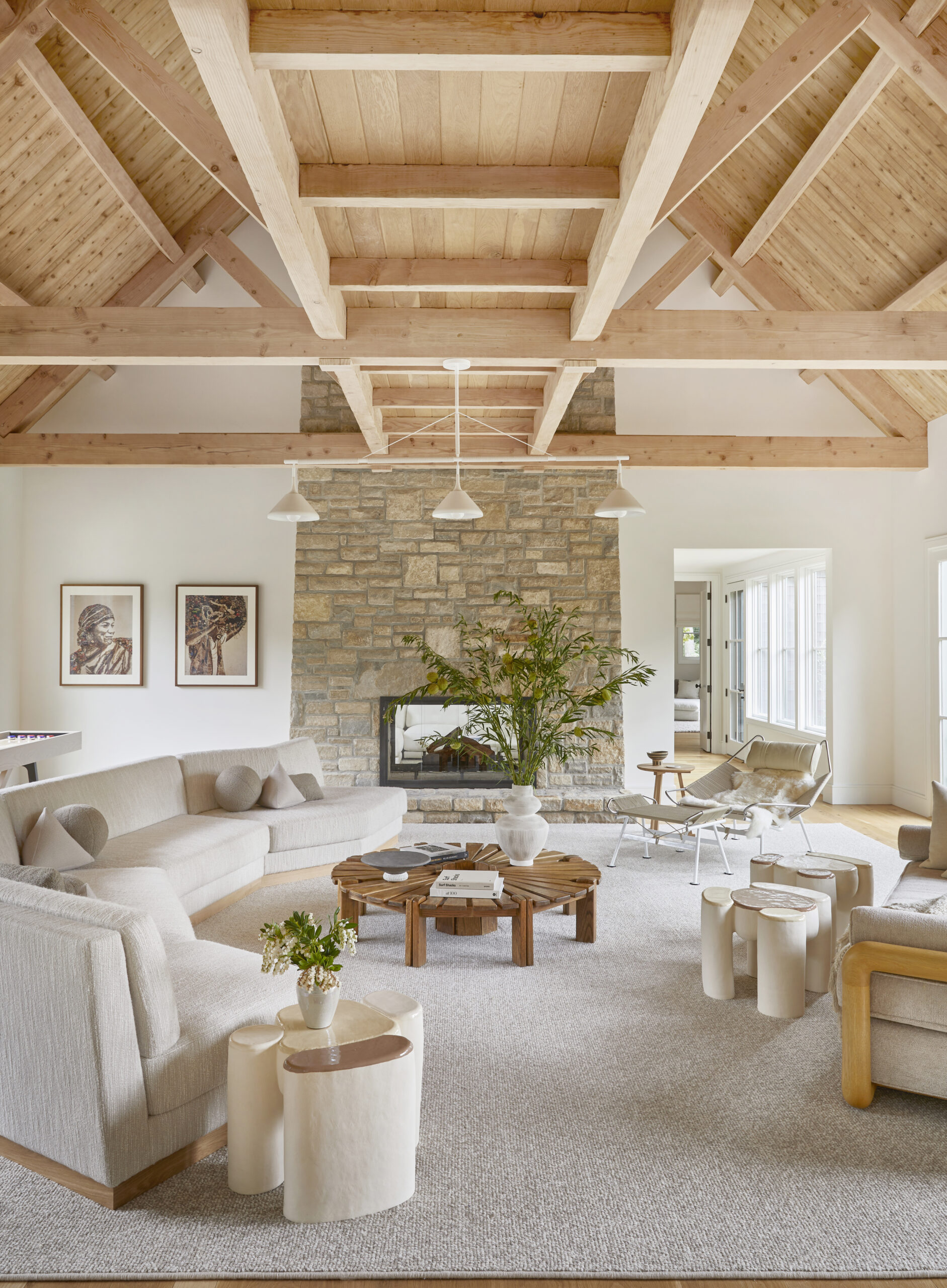 This Water Mill residence embraces its coastal setting, highlighting the expansive ceilings, large windows with lots of natural sunlight, and the home’s original architectural details. A neutral palette was used to create relaxed, welcoming spaces for everyday living and easy entertaining.